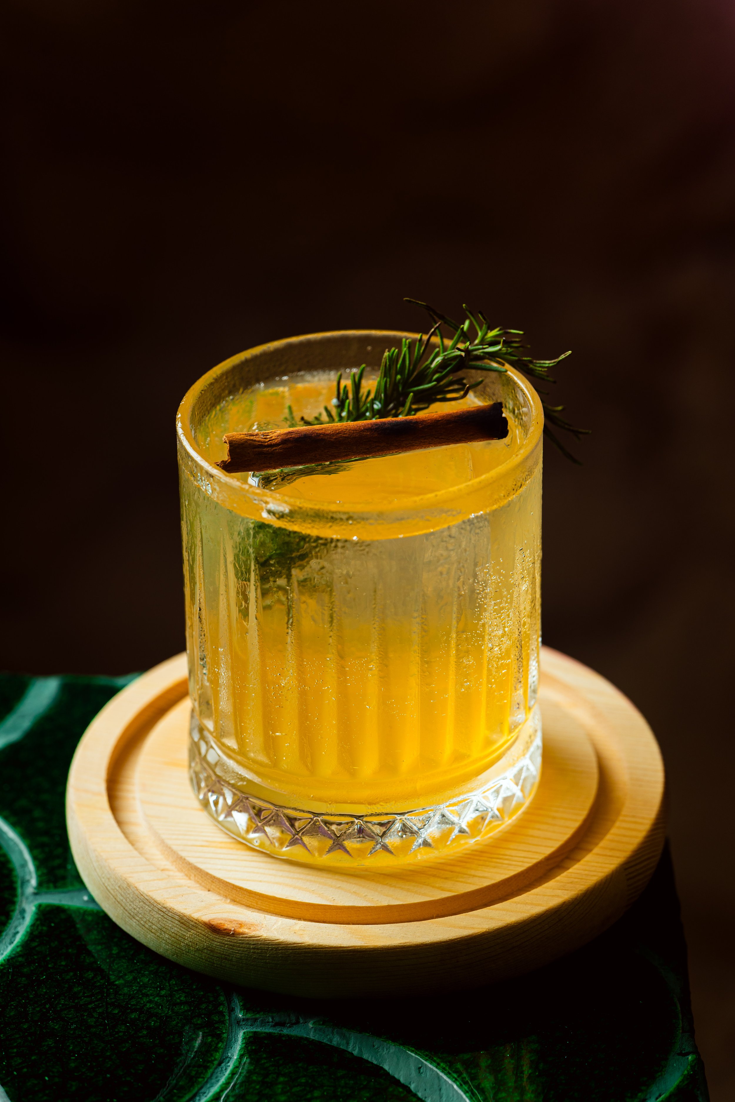 A glass of yellow-orange cocktail garnished with rosemary and a cinnamon stick on a wooden coaster.