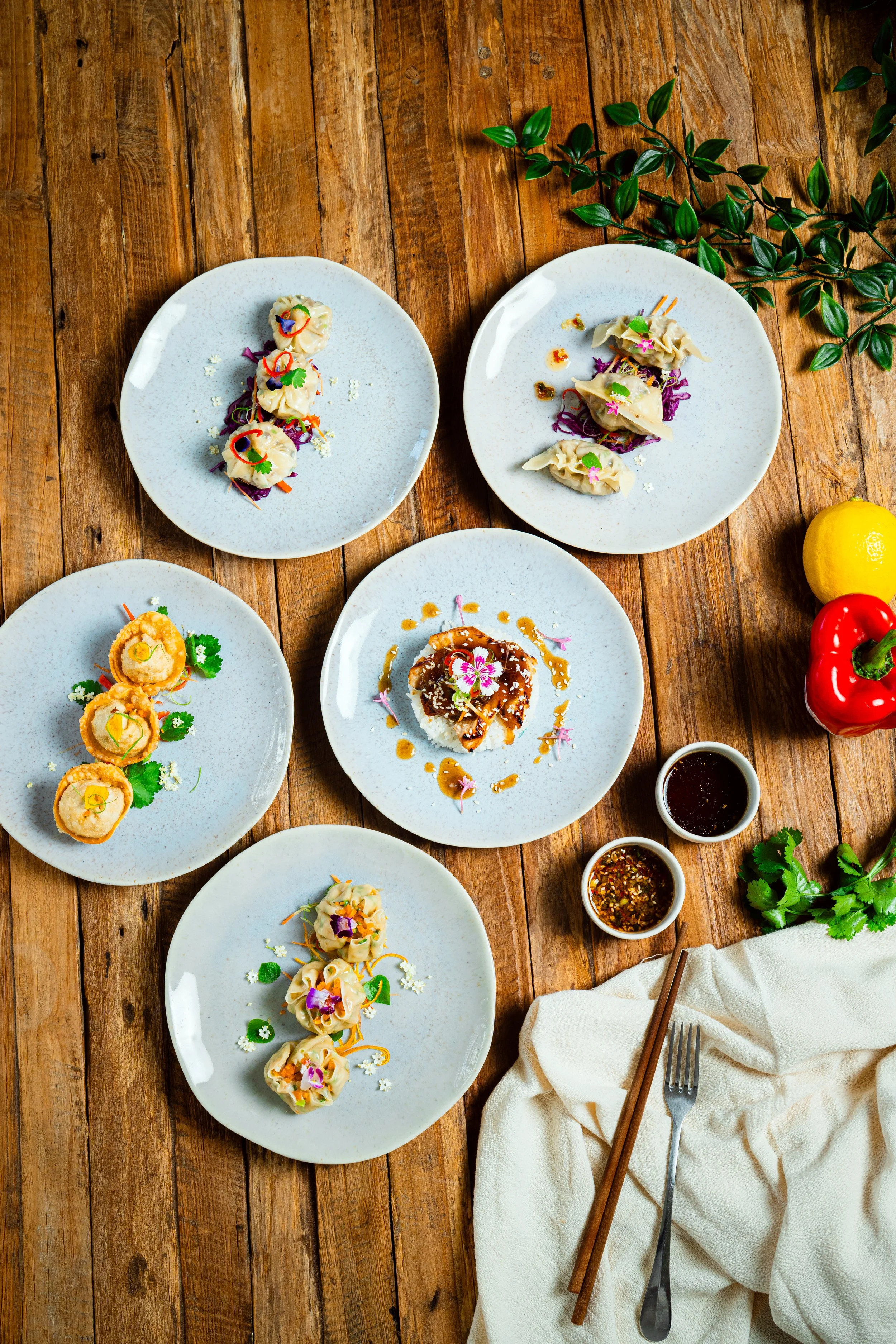 Several plates of gourmet Asian-inspired dishes on a wooden table, featuring tacos with various fillings, grilled shrimp with lemon, and other small appetizers, garnished with edible flowers and herbs.